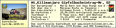 Bilderliste :Diese Galerie ist für javafähigen PC optimiert. Rating :Bewerte diesen Kilimanjaro-Gipfelbucheintrag.