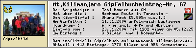 Informationen zur eigenen Besteigung des Mount Kilimanjaro, des höchsten Berg Afrikas, in das inoffizielle Gipfelbuch (The inofficial Mount Kilimanjaro Summit Log) auf www.mount-kilimanjaro.de ein.