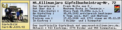 Der Gipfelerfolg am Mount Kilimanjaro : 2002Sonntag08September In der Zeit vom 04.09.2002 bis zum 10.09.2002 habe ich während einer 6-Tagestour mit dem Touroperator -- über die Machame Route den Mount Kilimanjaro, den höchsten Berg Afrikas, bis zum Summit Uhuru Peak [5.895m] am 08.09.2002 erfolgreich bestiegen und lege als Zeugnis die Summit-Certificate-Nr. 6181/02 bzw. das Gipfelfoto diesem Gipfelbucheintrag bei. Frank Nolte , 17.02.2004 Mein Kommentar zum Gipfelbucheintrag :Mount Kilimanjaro (Sept.2002) Ein langer Traum geht in Erfüllung. Wir alle drei schaffen bei super Wetter den Weg zum Uhuru Peak. Der Mt.Meru vorweg war optimal zur Akklimatisation.Jambo - I`ve made it ! Meine Track-Daten im Überblick :