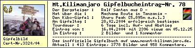 Der Gipfelerfolg am Mount Kilimanjaro : 2004Sonnabend28Februar In der Zeit vom 24.02.2004 bis zum 29.02.2004 habe ich während einer 6-Tagestour mit dem Touroperator -- über die Machame Route den Mount Kilimanjaro, den höchsten Berg Afrikas, bis zum Summit Uhuru Peak [5.895m] am 28.02.2004 erfolgreich bestiegen und lege als Zeugnis die Summit-Certificate-Nr. 3320/04 bzw. das Gipfelfoto diesem Gipfelbucheintrag bei. Ralf Santen , 16.04.2004 Mein Kommentar zum Gipfelbucheintrag :Der Weg war das Ziel und der Gipfel wurde erreicht. Ein Geschenk am Geburtstag auf dem Dach Afrikas den Sonnenaufgang zu erleben. Wir (Kristian, Frank und John, unsere Guides Dickson und Simon sowie ich) genossen bei -15°C den weiten Blick über die Wolkendecke unter uns. Kim aus unserer Gruppe musste leider einen Tag vor Gipfelanstieg aufgeben, aber seine Entscheidung war richtig.Jambo - I`ve made it ! Meine Track-Daten im Überblick :