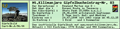 Der Gipfelerfolg am Mount Kilimanjaro : 2004Donnerstag24Juni In der Zeit vom 21.06.2004 bis zum 25.06.2004 habe ich während einer 5-Tagestour mit dem Touroperator -- über die Rongai Route den Mount Kilimanjaro, den höchsten Berg Afrikas, bis zum Summit Uhuru Peak [5.895m] am 24.06.2004 erfolgreich bestiegen und lege als Zeugnis die Summit-Certificate-Nr. 6/96/04 bzw. das Gipfelfoto diesem Gipfelbucheintrag bei. Raymund Mertes , 20.07.2004 Mein Kommentar zum Gipfelbucheintrag :Aufstieg mit einem tollen Team (alle haben es geschafft), super Begleitmannschaft und viel Spaß. Danke dem ganzem Team.Jambo - Kilimanjaro : Hakuna Matata ! Meine Track-Daten im Überblick :