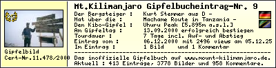 Machame Route : « Kein Eintrag « Eintrag-Nr.9 » [Eintrag Nr.10] » Kurt Stemmer - Uhuru Peak [5.895m] - 13.09.2000Bei eisigem Wind und NebelMein Gipfelbucheintrag :Der Eintrag in das Kilimanjaro-Gipfelbuch :2000Mittwoch06Dezember Kurt Stemmer aus Fridolfing , Bayern / Deutschland schrieb sich am 06.12.2000 mit dem folgenden Eintrag und
