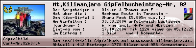 Der Gipfelerfolg am Mount Kilimanjaro : 2004Montag30August In der Zeit vom 26.08.2004 bis zum 31.08.2004 habe ich während einer 6-Tagestour mit dem Touroperator Ahsante-Tours über die Machame Route den Mount Kilimanjaro, den höchsten Berg Afrikas, bis zum Summit Uhuru Peak [5.895m] am 30.08.2004 erfolgreich bestiegen und lege als Zeugnis die Summit-Certificate-Nr. 9260/04 bzw. das Gipfelfoto diesem Gipfelbucheintrag bei. Oliver & Thomas , 17.10.2004 Mein Kommentar zum Gipfelbucheintrag :Sehr schöne Tour mit Ahsante-Tours und unseren Guides Rasta-Willie und Hale. Beliebte Phrasen unserer Guides: "Pole pole theres nothing to see up there (in the camps); Just there... monotone Antwort auf unsere Frage "wie weit noch?. Der Auf- und Abstieg wurde durch das gemeinsame Singen Bob Marleys Lieder versüsst: Dont worry - everythings gonna be alright. Asante sana.Jambo - Kilimanjaro : Hakuna Matata ! Meine Track-Daten im Überblick :