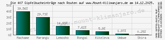 Die gesamten Kilimanjaro-Gipfelbucheinträge am 13.12.2025 Verteilung aller Einträge nach den gewählten Routen zum Gipfel