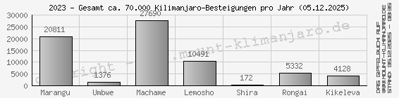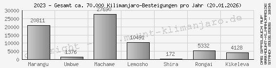 Eine Hochrechnung der jährlichen Touristen-Routenbelegung bei einem angenommenen Aufkommen von 70.000 *) Kilimanjaro-Besteigern auf allen Routen ( ca. 2023 ) unter Verwendung der mit den Einträgen im Mount Kilimanjaro-Gipfelbuch ermittelten Routenverteilung. Diese Zahlen beinhalten nicht die Begleitmannschaften mit Guide, Assi-Guide, Cook, Waiter, Porter.