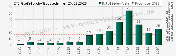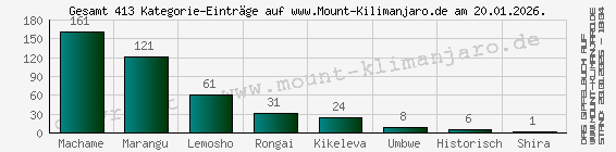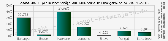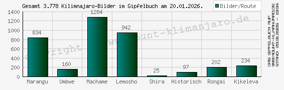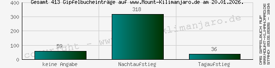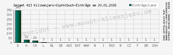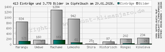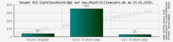 Auf dieser Statistik-Seite werden die mit den Gipfelbuch-Einträgen und Besuchen in der Datenbank hinterlegten Informationen zu den Kilimanjaro-Besteigungen statistisch ausgewertet und in 71 Grafiken, die mit jedem Seitenaufruf sich selbst aktualisieren, dargestellt. Da zu den Kilimanjaro-Besteigungen keine offiziellen Zahlen veröffentlicht werden, kann man sich hier zumindest über die Besteigungen aus dem deutschsprachigen Raum einen ersten Überblick verschaffen.