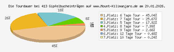 Die aktuelle Verteilung der Tourdauer zur Besteigung des Mount Kilimanjaro aus allen Gipfelbuch Einträgen nach prozentualen Werten.