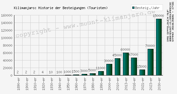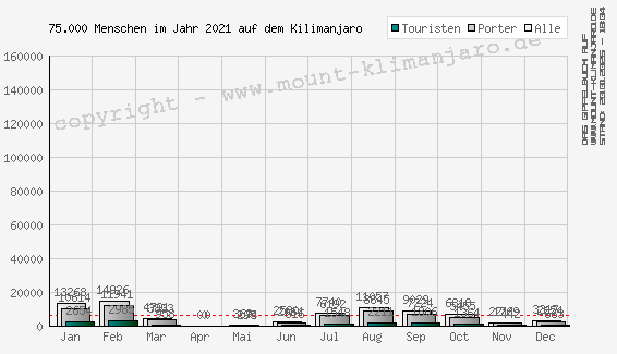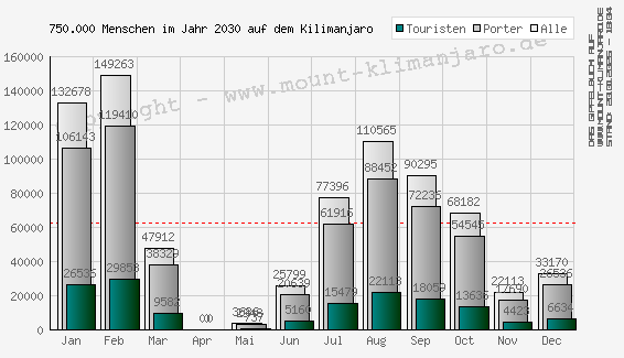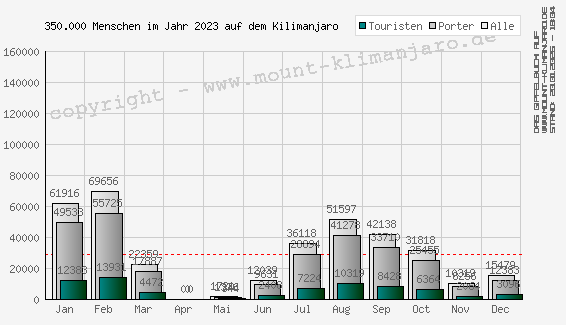 Eine Hochrechnung der monatlichen Touristen-Gesamtbelegung bei einem Aufkommen von 70.000 *) Kilimanjaro-Besteigern auf allen Routen ( 2023 ) unter Verwendung der mit den Einträgen im Mount Kilimanjaro-Gipfelbuch ermittelten monatlichen Aufstiege. Diese Zahlen beinhalten nicht die Begleitmannschaften mit Guide, Assi-Guide, Cook, Waiter, Porter.