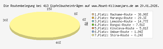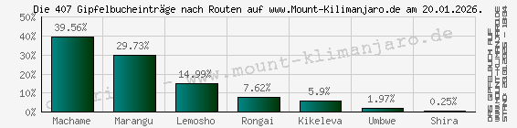 Die aktuelle, prozentuale Verteilung aller Gipfelbucheinträge in das Mount Kilimanjaro Gipfelbuchs nach den gewählten Aufstiegs-Routen zum Gipfel.