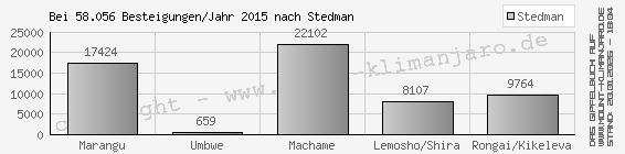 Bei 58.056 Kilimanjaro-Besteigern auf allen Routen im Jahr 2015 nach Stedman und einer prozentualen Routenverteilung entsprechend Gipfelbuch mit Stand vom 07.01.2016 ergibt sich eine jährliche Touristen-Routenbelegung entsprechend nebenstehender Grafik. Diese weicht offensichtlich minimal von der Grafik nach Stedman ab. Zum Vergleich sind hier ebenfalls die Lemosho- mit der Shira-Route und die Rongai- mit der Kikeleva-Route zusammengefasst worden.
