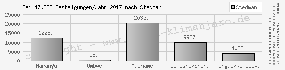 Bei 47.232 Kilimanjaro-Besteigern auf allen Routen im Jahr 2017 nach Stedman und einer prozentualen Routenverteilung entsprechend Gipfelbuch mit Stand vom 07.01.2016 ergibt sich eine jährliche Touristen-Routenbelegung entsprechend nebenstehender Grafik. Diese weicht offensichtlich minimal von der Grafik nach Stedman ab. Zum Vergleich sind hier ebenfalls die Lemosho- mit der Shira-Route und die Rongai- mit der Kikeleva-Route zusammengefasst worden.
