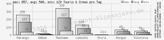 Eine Hochrechnung der täglichen Touristen- und Bergcrew-Routenbelegung (AVG.) bei einem angenommenen Aufkommen von 50.000 *) Kilimanjaro-Besteigern pro Jahr auf allen Routen ( ca.2010 ) und einem Aufkommen von 90% in den 7 Hauptsaison-Monaten (Max.) und 10% in den 5 Nebensaison-Monaten (Min.) unter Verwendung der mit den Einträgen im Mount Kilimanjaro-Gipfelbuch ermittelten Routenverteilung. Im Durchschnitt kommen auf jeden Besteiger ca. 3 Crew-Mitglieder, die die Funktionen des Guide, Assi-Guide, Cook, Waiter und Porter übernehmen.