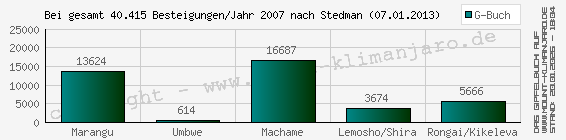 Bei 40.412 Kilimanjaro-Besteigern auf allen Routen im Jahr 2007 nach Stedman und einer prozentualen Routenverteilung entsprechend Gipfelbuch mit Stand vom 07.01.2013 ergibt sich eine jährliche Touristen-Routenbelegung entsprechend nebenstehender Grafik. Diese weicht offensichtlich minimal von der Grafik nach Stedman ab. Zum Vergleich sind hier ebenfalls die Lemosho- mit der Shira-Route und die Rongai- mit der Kikeleva-Route zusammengefasst worden.