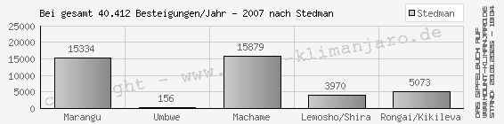 Von 40.412 Kilimanjaro-Besteigern auf allen Routen im Jahr 2007 geht Henry Stedman in seinem Buch Kilimanjaro. The Trekking Guide to Africa's Highest Mountain aus, die sich entsprechend nebenstehender Grafik auf die einzelnen Routen verteilen. Gegenüber den Gipfelbucherfassungen sind hier die Lemosho- mit der Shira-Route und die Rongai- mit der Kikeleva-Route zusammengefasst worden.