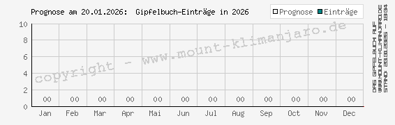 Die aktuelle Verteilung der Mount Kilimanjaro Gipfelbuch Einträge auf die Monate im Jahr 2026 mit den Einträgen pro Monat als Prognose.