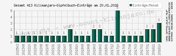 Die aktuelle Verteilung der Mount Kilimanjaro Gipfelbuch Einträge in den letzen 25 Monaten mit den Einträgen pro Monat.