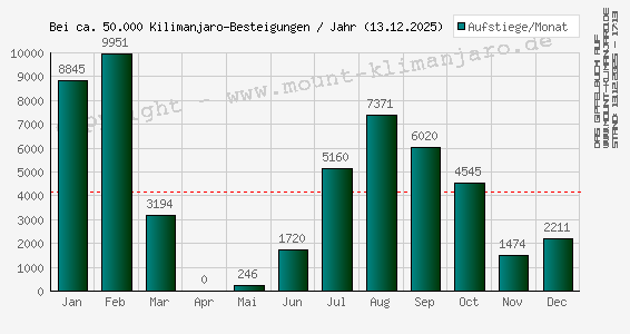 Die monatliche Gesamtbelegung am Mount Kilimanjaro ( 14.12.2025 ) Eine Hochrechnung der monatlichen Aufstiege bei ca. 50.000 Kilimanjaro-Besteigern / a (2010).