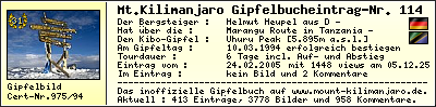 Signatur  | Gipfelerfolg | Titel : | Uhuru Peak 1994 | | Name : | Helmut Heupel | | Gipfel-Datum : | 10.03.1994 | | Gipfel-Alter : | 31 Jahre | | Gipfel-Jahr : | 1994 | |
