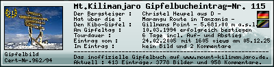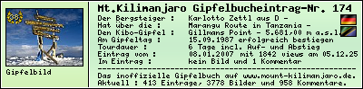 Signatur  | Gipfelerfolg | Titel : | Uhuru Peak bei Sonnenaufgang | | Name : | Axel Günther | | Gipfel-Datum : | 27.02.1995 | | Gipfel-Alter : | 30 Jahre | | Gipfel-Jahr : | 1995 | |