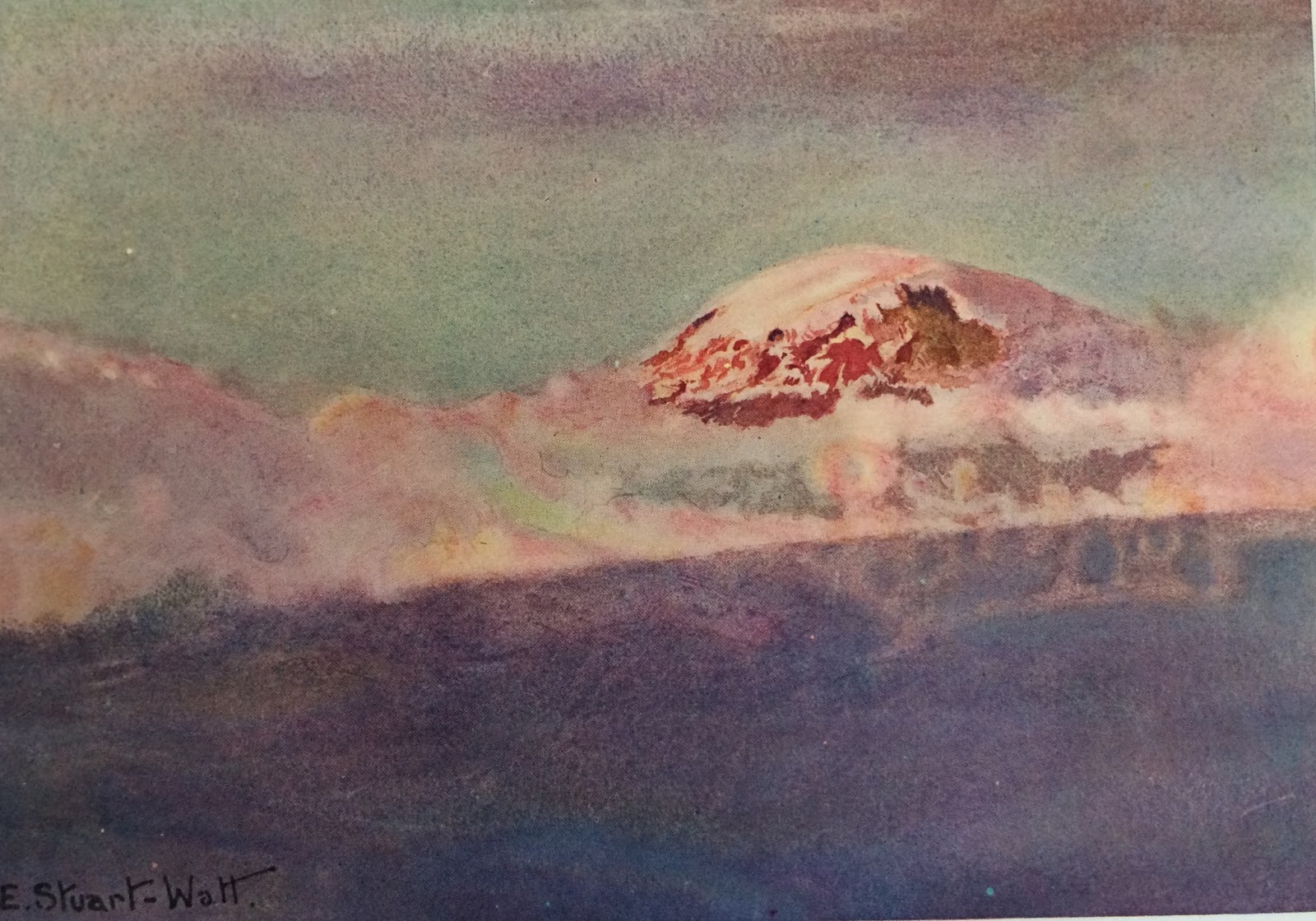 Eva Stuard Watt. This young missionary lived with her mother and sister on Kilimanjaro from 1924 - 1927. She recounts many of the Wachagga stories, including their tale of humankind's fall from God's grace. Watt ascended the slope in September 1926. There's a great photograph of her kneeling next to the frozen leopard, first publicly reported by Dr. Donald latham, who dug it out of the snows, and later made famous in Hemmingway's Snow of kilimanjaro. Ms. Eva Stuart-Watt wrote of the leopard: "No one can tell what induced it to venture into a land so cold and desolate; but possibly the smell of