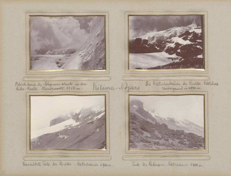 1903 - Kilima-Njaro - Carl Uhlig - links oben: Blick durch die Johannesscharte in den Kibo-Krater aus 5950 m rechts oben: Die Gletscherbrüche des Richter-Gletschers in 4800 m am Kilima-Ndjaro links unten: Verschüttete Teile des Richter-Gletschers in 4900 m am Kilima-Ndjaro rechts unten: Ende des Rebmann-Gletschers in 4800 m am Kilima-Ndjaro
