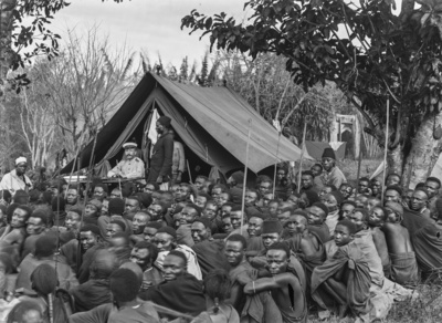 1886/1898, Dr. Hans Meyer, Versammlung mit Männern der Chagga und Hauptmann Kurt Johannes, der vor einem Zelt an einem Tisch sitzt