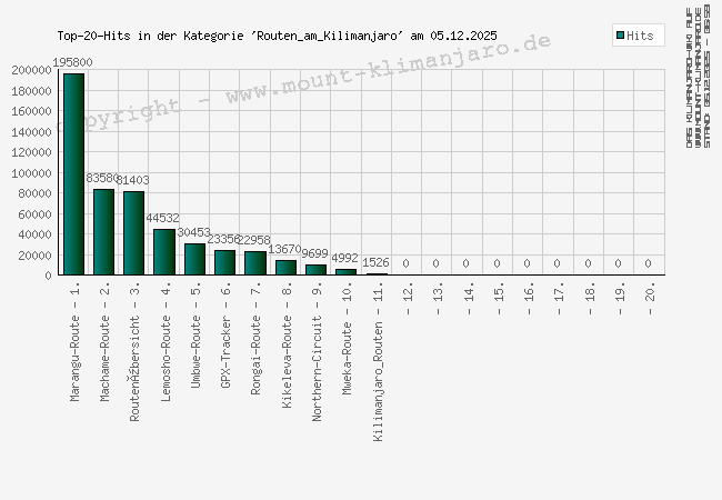 • Statistik der Belegung der Marangu-Route im Verhältnis zu den anderen Routen am Kilimanjaro wird aktuell aus den Einträgen in das Kilimanjaro-Gipfelbuch ermittelt.