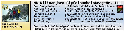 Bilderliste :Diese Galerie ist für javafähigen PC optimiert. Rating :Bewerte diesen Kilimanjaro-Gipfelbucheintrag.