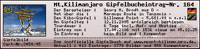 Der Gipfelerfolg am Mount Kilimanjaro : 2005Sonnabend12November In der Zeit vom 08.11.2005 bis zum 13.11.2005 habe ich während einer 6-Tagestour mit dem Touroperator -- über die Marangu Route den Mount Kilimanjaro, den höchsten Berg Afrikas, bis zum Summit Gillmans Point [5.681m] am 12.11.2005 erfolgreich bestiegen und lege als Zeugnis die Summit-Certificate-Nr. 3454/05 bzw. das Gipfelfoto diesem Gipfelbucheintrag bei. Georg H. Brodt , 17.04.2006 Mein Kommentar zum Gipfelbucheintrag :Aufstieg im November 2005Jambo - I`ve made it ! Meine Track-Daten im Überblick :