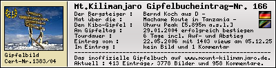 Der Gipfelerfolg am Mount Kilimanjaro : 2004Donnerstag29Januar In der Zeit vom 25.01.2004 bis zum 30.01.2004 habe ich während einer 6-Tagestour mit dem Touroperator -- über die Machame Route den Mount Kilimanjaro, den höchsten Berg Afrikas, bis zum Summit Uhuru Peak [5.895m] am 29.01.2004 erfolgreich bestiegen und lege als Zeugnis die Summit-Certificate-Nr. 1383/04 bzw. das Gipfelfoto diesem Gipfelbucheintrag bei. Bernd Koch , 22.05.2006 Mein Kommentar zum Gipfelbucheintrag :Aufstieg im Januar 2004Jambo - I`ve made it ! Meine Track-Daten im Überblick :