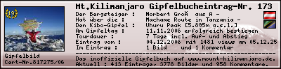 Der Gipfelerfolg am Mount Kilimanjaro : 2006Sonnabend11November In der Zeit vom 06.11.2006 bis zum 12.11.2006 habe ich während einer 7-Tagestour mit dem Touroperator -- über die Machame Route den Mount Kilimanjaro, den höchsten Berg Afrikas, bis zum Summit Uhuru Peak [5.895m] am 11.11.2006 erfolgreich bestiegen und lege als Zeugnis die Summit-Certificate-Nr. 817275/06 bzw. das Gipfelfoto diesem Gipfelbucheintrag bei. Norbert Groß , 04.12.2006 Mein Kommentar zum Gipfelbucheintrag :Aufstieg im November 2006Jambo - I`ve made it ! Meine Track-Daten im Überblick :
