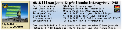 Informationen zur eigenen Besteigung des Mount Kilimanjaro, des höchsten Berg Afrikas, in das inoffizielle Gipfelbuch (The inofficial Mount Kilimanjaro Summit Log) auf www.mount-kilimanjaro.de ein.