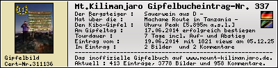 Informationen zur eigenen Besteigung des Mount Kilimanjaro, des höchsten Berg Afrikas, in das inoffizielle Gipfelbuch (The inofficial Mount Kilimanjaro Summit Log) auf www.mount-kilimanjaro.de ein.