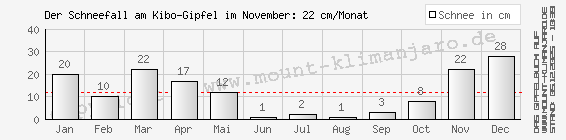 Die Kilimanjaro-Besteigungen in den 2014-er Jahren:Die Monats-Besteigungen auf allen Routen (Show/Hide)Die aktuelle Routennutzung am Mount Kilimanjaro :Die von mir / uns begangene Lemosho Route wurde im Verhältnis zu den weiteren Routen am Mount Kilimanjaro entsprechend folgender Grafik von allen Besteigern aus dem Kilimanjaro-Gipfelbuch zum Gipfelaufstieg genutzt.Die gesamten Kilimanjaro-Gipfelbucheinträge am 05.12.2025 Verteilung der Gipfelbuch-Einträge auf die einzelnen Routen : prozentual Die maximalen Besteigungen am Kilimanjaro (2013) :1.0 Die Monats-Besteigungen auf allen Routen (Show/Hide)2.0 Die Monats-Besteigungen auf der Lemosho Route (Show/Hide) 3.0 Die Tages-Besteigungen auf der Lemosho Route (Show/Hide) Das Wetter am Kilimanjaro zu meiner Besteigung :Die durchschnittlichen Wetter- / Klimadaten am Kilimanjaro während des 14.11.2015, zum Zeitraumes meiner Gipfel-Besteigung, im Verhältnis zu den anderen Monaten sind aus dem folgenden Niederschlags- und Temperaturdiagramm zu entnehmen. Basis der Durchschnittswerte sind Meteorologische Berechnungen der letzten 20 Jahren. Die tatsächlichen Werte können somit abweichen.Die Jahreszeit zu meiner Besteigung : Beginn der kurzen Regenzeit (Frühling) Der monatliche Durchschnitts-Niederschlag in Moshi am Fuß des Kibo in mm/M Temperatur - Mässig - min. 17°C - max. 31°C , Jahreszeit - Kleine Regenzeit . Im Besteigungungsmonat November - Besucherzahl: Niedrig (Nachsaison). Der monatliche Schneefall am Gipfel des Kibo ab 5.700 m a.m.S.L. im November in cm Im Zusammenhang mit dem Schneefall in den anderen Monaten des Jahres . Die monatlichen Durchschnitts-Temperaturen in Moshi im November in °C Im Zusammenhang mit den anderen Monatstemperaturen des Jahres . Die monatlichen Temperaturen in den versch. Höhenlagen am Kibo im November in °C Im Zusammenhang mit den anderen Monatstemperaturen des Jahres . Rechtlicher Hinweis : Die aufgeführten Klimawerte sind Durchschnittswerte und daher nur bedingt als Klimaprognose / Wettervorhersage geeignet. Ein Rechtsanspruch daraus ist prinzipiell ausgeschlossen. Meine Kilimanjaro-Gipfelbilder (0 Bilder) :Diese Galerie ist für die Betrachtung mit Smartphones optimiert.Die folgenden Bilder meiner Kilimanjaro-Besteigung habe ich meinem Gipfelbucheintrag hinzugefügt.