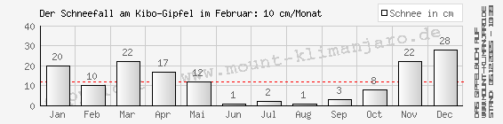 Die Kilimanjaro-Besteigungen in den 2016-er Jahren:Die Monats-Besteigungen auf allen Routen (Show/Hide)Die aktuelle Routennutzung am Mount Kilimanjaro :Die von mir / uns begangene Umbwe Route wurde im Verhältnis zu den weiteren Routen am Mount Kilimanjaro entsprechend folgender Grafik von allen Besteigern aus dem Kilimanjaro-Gipfelbuch zum Gipfelaufstieg genutzt.Die gesamten Kilimanjaro-Gipfelbucheinträge am 05.12.2025 Verteilung der Gipfelbuch-Einträge auf die einzelnen Routen : prozentual Die maximalen Besteigungen am Kilimanjaro (2013) :1.0 Die Monats-Besteigungen auf allen Routen (Show/Hide)2.0 Die Monats-Besteigungen auf der Umbwe Route (Show/Hide) 3.0 Die Tages-Besteigungen auf der Umbwe Route (Show/Hide) Das Wetter am Kilimanjaro zu meiner Besteigung :Die durchschnittlichen Wetter- / Klimadaten am Kilimanjaro während des 18.02.2018, zum Zeitraumes meiner Gipfel-Besteigung, im Verhältnis zu den anderen Monaten sind aus dem folgenden Niederschlags- und Temperaturdiagramm zu entnehmen. Basis der Durchschnittswerte sind Meteorologische Berechnungen der letzten 20 Jahren. Die tatsächlichen Werte können somit abweichen.Die Jahreszeit zu meiner Besteigung : Ende der kurzen Trockenzeit (Sommer) Der monatliche Durchschnitts-Niederschlag in Moshi am Fuß des Kibo in mm/M Temperatur - Warm - min. 17°C - max. 33°C , Jahreszeit - Kleine Trockenzeit . Im Besteigungungsmonat Februar - Besucherzahl: Sehr Hoch (Hauptsaison). Der monatliche Schneefall am Gipfel des Kibo ab 5.700 m a.m.S.L. im Februar in cm Im Zusammenhang mit dem Schneefall in den anderen Monaten des Jahres . Die monatlichen Durchschnitts-Temperaturen in Moshi im Februar in °C Im Zusammenhang mit den anderen Monatstemperaturen des Jahres . Die monatlichen Temperaturen in den versch. Höhenlagen am Kibo im Februar in °C Im Zusammenhang mit den anderen Monatstemperaturen des Jahres . Rechtlicher Hinweis : Die aufgeführten Klimawerte sind Durchschnittswerte und daher nur bedingt als Klimaprognose / Wettervorhersage geeignet. Ein Rechtsanspruch daraus ist prinzipiell ausgeschlossen. Meine Kilimanjaro-Gipfelbilder (10 Bilder) :Diese Galerie ist für die Betrachtung mit Smartphones optimiert.Die folgenden Bilder meiner Kilimanjaro-Besteigung habe ich meinem Gipfelbucheintrag hinzugefügt.