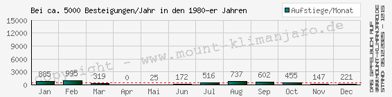 Die Kilimanjaro-Besteigungen in den 1980-er Jahren:Die Monats-Besteigungen auf allen Routen (Show/Hide)Die aktuelle Routennutzung am Mount Kilimanjaro :Die von mir / uns begangene Marangu Route wurde im Verhältnis zu den weiteren Routen am Mount Kilimanjaro entsprechend folgender Grafik von allen Besteigern aus dem Kilimanjaro-Gipfelbuch zum Gipfelaufstieg genutzt.Die gesamten Kilimanjaro-Gipfelbucheinträge am 05.12.2025 Verteilung der Gipfelbuch-Einträge auf die einzelnen Routen : prozentual Die maximalen Besteigungen am Kilimanjaro (2013) :1.0 Die Monats-Besteigungen auf allen Routen (Show/Hide)2.0 Die Monats-Besteigungen auf der Marangu Route (Show/Hide) 3.0 Die Tages-Besteigungen auf der Marangu Route (Show/Hide) Das Wetter am Kilimanjaro zu meiner Besteigung :Die durchschnittlichen Wetter- / Klimadaten am Kilimanjaro während des 25.12.1981, zum Zeitraumes meiner Gipfel-Besteigung, im Verhältnis zu den anderen Monaten sind aus dem folgenden Niederschlags- und Temperaturdiagramm zu entnehmen. Basis der Durchschnittswerte sind Meteorologische Berechnungen der letzten 20 Jahren. Die tatsächlichen Werte können somit abweichen.Die Jahreszeit zu meiner Besteigung : Ende der kurzen Regenzeit (Frühling/Sommer) Der monatliche Durchschnitts-Niederschlag in Moshi am Fuß des Kibo in mm/M Temperatur - Warm - min. 17°C - max. 32°C , Jahreszeit - Kleine Regenzeit . Im Besteigungungsmonat Dezember - Besucherzahl: Niedrig (Vorsaison). Der monatliche Schneefall am Gipfel des Kibo ab 5.700 m a.m.S.L. im Dezember in cm Im Zusammenhang mit dem Schneefall in den anderen Monaten des Jahres . Die monatlichen Durchschnitts-Temperaturen in Moshi im Dezember in °C Im Zusammenhang mit den anderen Monatstemperaturen des Jahres . Die monatlichen Temperaturen in den versch. Höhenlagen am Kibo im Dezember in °C Im Zusammenhang mit den anderen Monatstemperaturen des Jahres . Rechtlicher Hinweis : Die aufgeführten Klimawerte sind Durchschnittswerte und daher nur bedingt als Klimaprognose / Wettervorhersage geeignet. Ein Rechtsanspruch daraus ist prinzipiell ausgeschlossen. Meine Kilimanjaro-Gipfelbilder (16 Bilder) :Diese Galerie ist für die Betrachtung mit Smartphones optimiert.Die folgenden Bilder meiner Kilimanjaro-Besteigung habe ich meinem Gipfelbucheintrag hinzugefügt.