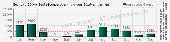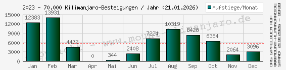 Die Kilimanjaro-Besteigungen in den 2016-er Jahren:Die Monats-Besteigungen auf allen Routen (Show/Hide)Die aktuelle Routennutzung am Mount Kilimanjaro :Die von mir / uns begangene Marangu Route wurde im Verh�ltnis zu den weiteren Routen am Mount Kilimanjaro entsprechend folgender Grafik von allen Besteigern aus dem Kilimanjaro-Gipfelbuch zum Gipfelaufstieg genutzt.Die gesamten Kilimanjaro-Gipfelbucheintr�ge am 17.04.2026 Verteilung der Gipfelbuch-Eintr�ge auf die einzelnen Routen : prozentual ![]() Die maximalen Besteigungen am Kilimanjaro (2013) :1.0 Die Monats-Besteigungen auf allen Routen (Show/Hide)2.0 Die Monats-Besteigungen auf der Marangu Route (Show/Hide) 3.0 Die Tages-Besteigungen auf der Marangu Route (Show/Hide) Das Wetter am Kilimanjaro zu meiner Besteigung :Die durchschnittlichen Wetter- / Klimadaten am Kilimanjaro w�hrend des 30.03.2018, zum Zeitraumes meiner Gipfel-Besteigung, im Verh�ltnis zu den anderen Monaten sind aus dem folgenden Niederschlags- und Temperaturdiagramm zu entnehmen. Basis der Durchschnittswerte sind Meteorologische Berechnungen der letzten 20 Jahren. Die tatsächlichen Werte können somit abweichen.Die Jahreszeit zu meiner Besteigung : Beginn der großen Regenzeit (Sommer/Herbst) Der monatliche Durchschnitts-Niederschlag in Moshi am Fuß des Kibo in mm/M Temperatur - Mässig - min. 18°C - max. 32°C , Jahreszeit - Grosse Regenzeit . Im Besteigungungsmonat März - Besucherzahl: Mittel (Nachsaison). ![]() Der monatliche Schneefall am Gipfel des Kibo ab 5.700 m a.m.S.L. im März in cm Im Zusammenhang mit dem Schneefall in den anderen Monaten des Jahres . ![]() Die monatlichen Durchschnitts-Temperaturen in Moshi im März in �C Im Zusammenhang mit den anderen Monatstemperaturen des Jahres . ![]() Die monatlichen Temperaturen in den versch. Höhenlagen am Kibo im März in �C Im Zusammenhang mit den anderen Monatstemperaturen des Jahres . ![]() Rechtlicher Hinweis : Die aufgef�hrten Klimawerte sind Durchschnittswerte und daher nur bedingt als Klimaprognose / Wettervorhersage geeignet. Ein Rechtsanspruch daraus ist prinzipiell ausgeschlossen. Meine Kilimanjaro-Gipfelbilder (22 Bilder) :Diese Galerie ist für die Betrachtung mit Smartphones optimiert.Die folgenden Bilder meiner Kilimanjaro-Besteigung habe ich meinem Gipfelbucheintrag hinzugefügt.