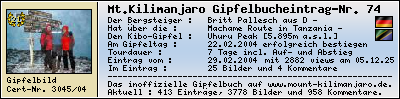 Informationen zur eigenen Besteigung des Mount Kilimanjaro, des höchsten Berg Afrikas, in das inoffizielle Gipfelbuch (The inofficial Mount Kilimanjaro Summit Log) auf www.mount-kilimanjaro.de ein.