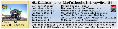 Der Gipfelerfolg am Mount Kilimanjaro : 2003Sonnabend30August In der Zeit vom 26.08.2003 bis zum 31.08.2003 habe ich während einer 6-Tagestour mit dem Touroperator -- über die Machame Route den Mount Kilimanjaro, den höchsten Berg Afrikas, bis zum Summit Uhuru Peak [5.895m] am 30.08.2003 erfolgreich bestiegen und lege als Zeugnis die Summit-Certificate-Nr. 7030/03 bzw. das Gipfelfoto diesem Gipfelbucheintrag bei. David Vasicek , 27.07.2004 Mein Kommentar zum Gipfelbucheintrag :Ein einmaliges Reiseerlebnis mit einem tollen Team. Wir zehren immer noch von dieser Reise.Meine Track-Daten im Überblick :