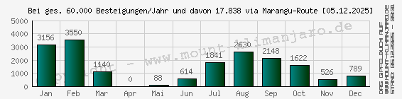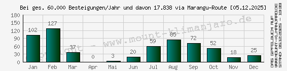 Marangu RouteBesteigungen des Mount Kilimanjaro, die über die Marangu Route erfolgten. Mount Kilimanjaro mit Marangu Route » Routen-Statistik für die Marangu Route nach Gipfelbucheinträgen : - Der letzte Eintrag für die Marangu Route erfolgte am : 27.08.2023 - Die Anzahl der Einträge für die Marangu Route : 121 Einträge von gesamt 413 Gipfelbuch-Einträgen - Wie beliebt ist die Marangu Route im Vergleich zu den anderen Routen am Mount Kilimanjaro nach Gipfelbuch-Einträgen : --- Die Marangu Route : 121 von 413 = 29.3 % --- Die Umbwe Route : 8 von 413 = 1.94 % --- Die Machame Route : 161 von 413 = 38.98 % --- Die Lemosho Route : 61 von 413 = 14.77 % --- Die Shira Route : 1 von 413 = 0.24 % --- Die Historisch : 6 von 413 = 1.45 % --- Die Rongai Route : 31 von 413 = 7.51 % --- Die Kikeleva Route : 24 von 413 = 5.81 %
