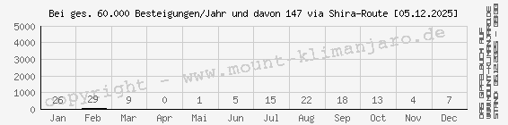Shira RouteBesteigungen des Mount Kilimanjaro, die über die Shira Route erfolgten. Mount Kilimanjaro mit Shira Route » Routen-Statistik für die Shira Route nach Gipfelbucheinträgen : - Der letzte Eintrag für die Shira Route erfolgte am : 26.02.2010 - Die Anzahl der Einträge für die Shira Route : 1 Einträge von gesamt 413 Gipfelbuch-Einträgen - Wie beliebt ist die Shira Route im Vergleich zu den anderen Routen am Mount Kilimanjaro nach Gipfelbuch-Einträgen : --- Die Shira Route : 1 von 413 = 0.24 % --- Die Marangu Route : 121 von 413 = 29.3 % --- Die Umbwe Route : 8 von 413 = 1.94 % --- Die Machame Route : 161 von 413 = 38.98 % --- Die Lemosho Route : 61 von 413 = 14.77 % --- Die Historisch : 6 von 413 = 1.45 % --- Die Rongai Route : 31 von 413 = 7.51 % --- Die Kikeleva Route : 24 von 413 = 5.81 %