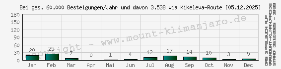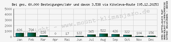 Kikeleva RouteBesteigungen des Mount Kilimanjaro, die über die Kileleva Route erfolgten. Mount Kilimanjaro mit Kikeleva Route » Routen-Statistik für die Kikeleva Route nach Gipfelbucheinträgen : - Der letzte Eintrag für die Kikeleva Route erfolgte am : 22.03.2019 - Die Anzahl der Einträge für die Kikeleva Route : 24 Einträge von gesamt 413 Gipfelbuch-Einträgen - Wie beliebt ist die Kikeleva Route im Vergleich zu den anderen Routen am Mount Kilimanjaro nach Gipfelbuch-Einträgen : --- Die Kikeleva Route : 24 von 413 = 5.81 % --- Die Marangu Route : 121 von 413 = 29.3 % --- Die Umbwe Route : 8 von 413 = 1.94 % --- Die Machame Route : 161 von 413 = 38.98 % --- Die Lemosho Route : 61 von 413 = 14.77 % --- Die Shira Route : 1 von 413 = 0.24 % --- Die Historisch : 6 von 413 = 1.45 % --- Die Rongai Route : 31 von 413 = 7.51 %