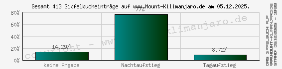 Die aktuelle Verteilung des Zeitpunkts des Krateraufstiegs der Mount Kilimanjaro Gipfelbuch Einträge als Tag- oder Nachtaufstieg nach prozentualen Werten.