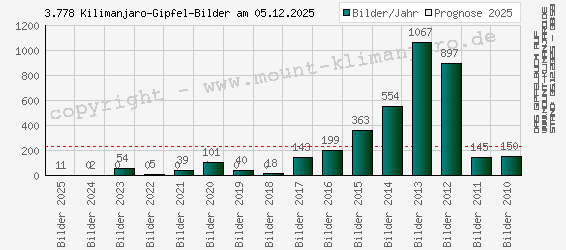 Der Bildupload in das Kilimanjaro-Gipfelbuch pro Jahr seit der Gipfelbuch-Neuauflage im Jahr 2010.