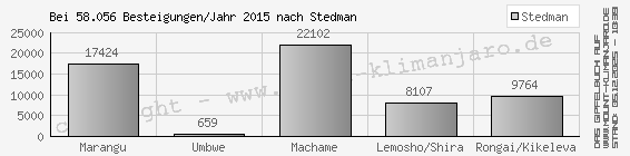 Bei 58.056 Kilimanjaro-Besteigern auf allen Routen im Jahr 2015 nach Stedman und einer prozentualen Routenverteilung entsprechend Gipfelbuch mit Stand vom 07.01.2016 ergibt sich eine jährliche Touristen-Routenbelegung entsprechend nebenstehender Grafik. Diese weicht offensichtlich minimal von der Grafik nach Stedman ab. Zum Vergleich sind hier ebenfalls die Lemosho- mit der Shira-Route und die Rongai- mit der Kikeleva-Route zusammengefasst worden.